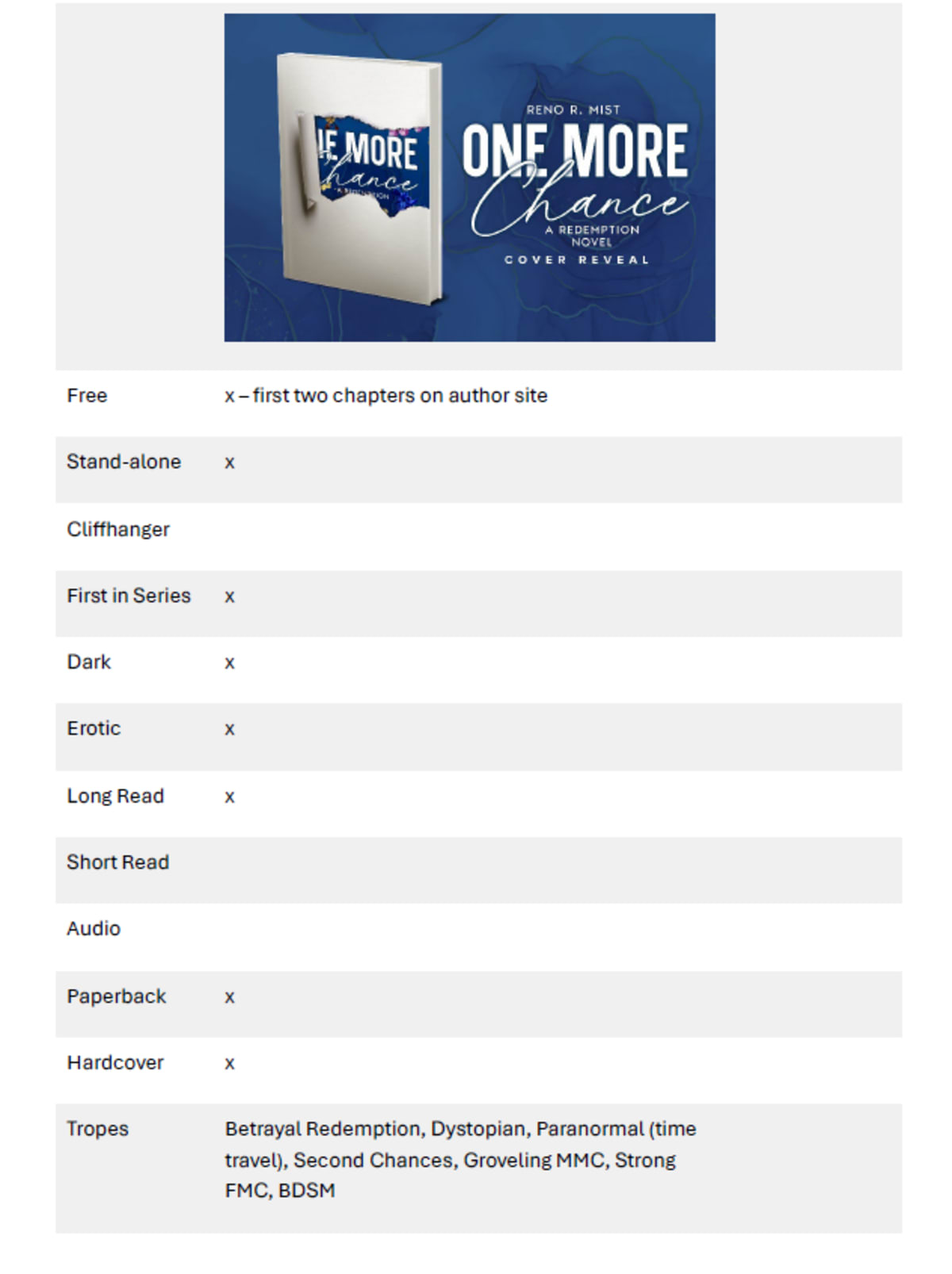 Set in a world about to fracture, One More Chance follows a man desperate to rewrite his mistakes and win back the woman who refuses to let him off easy.